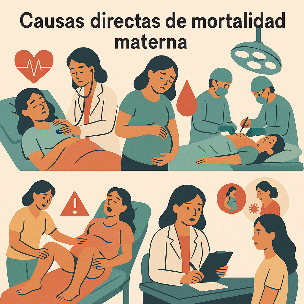 Las causas directas de mortalidad materna son aquellas que se derivan directamente de complicaciones del embarazo, el parto o el puerperio, así como de intervenciones, omisiones, tratamientos inadecuados o eventos relacionados con ellos. Estas causas son consideradas prevenibles en su mayoría, siempre que existan servicios de salud accesibles, oportunos y con capacidad resolutiva adecuada. Identificarlas permite establecer prioridades clínicas y programáticas en la atención obstétrica.